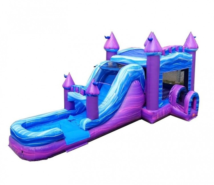 Take the fun and excitement of jumping and playing in a water slide bounce house and MEGA SIZE it with the Mega Tropical Purple Marble Water Slide Bounce House Combo! From their bright, vibrant colors, to the spacious bouncing area and incredibly fun big slide, kids can't help but look at these units in awe. This unit stretches out for 32' feet of fun, exciting activities that may even have a few parents secretly wanting to jump in! Crawl into the bouncing area through our upgraded, enclosed tunnel entrance. Have a blast jumping, bouncing and laughing the day away on this mega bouncer! Climb up the short rock climb wall to get a view of the flowing water down the slide. Get ready, then head down into the splash pool at the bottom for a grand finale and some photos for the scrapbook! The Mega Tropical Purple Marble Water Slide Bounce House Combo brings everything needed to the party to have a great time, and fill it with all the joy that kids (and adults!) want on a fun, exciting and memorable play day.