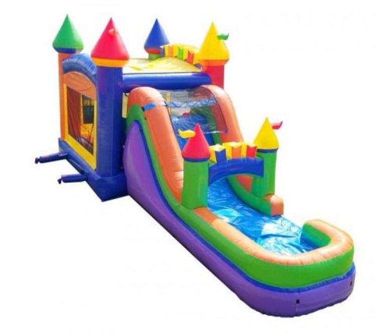 Take the fun and excitement of jumping and playing in a water slide bounce house and MEGA SIZE it with the Mega Rainbow Water Slide Bounce House Combo! From their bright, vibrant colors, to the spacious bouncing area and incredibly fun big slide, kids can't help but look at these units in awe. This unit stretches out for 32' feet of fun, exciting activities that may even have a few parents secretly wanting to jump in! Crawl into the bouncing area through our upgraded, enclosed tunnel entrance. Have a blast jumping, bouncing and laughing the day away on this mega bouncer! Climb up the short rock climb wall to get a view of the flowing water down the slide. Get ready, then head down into the splash pool at the bottom for a grand finale and some photos for the scrapbook! The Mega Rainbow Water Slide Bounce House Combo brings everything needed to the party to have a great time, and fill it with all the joy that kids (and adults!) want on a fun, exciting and memorable play day.