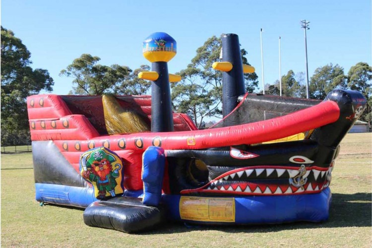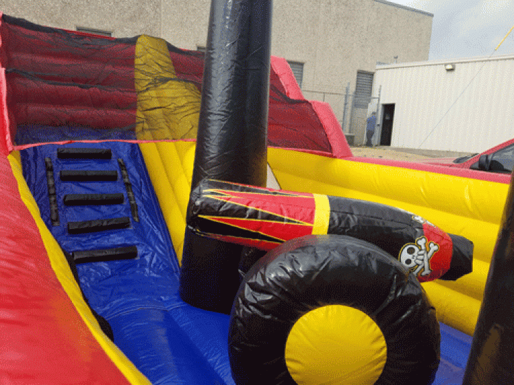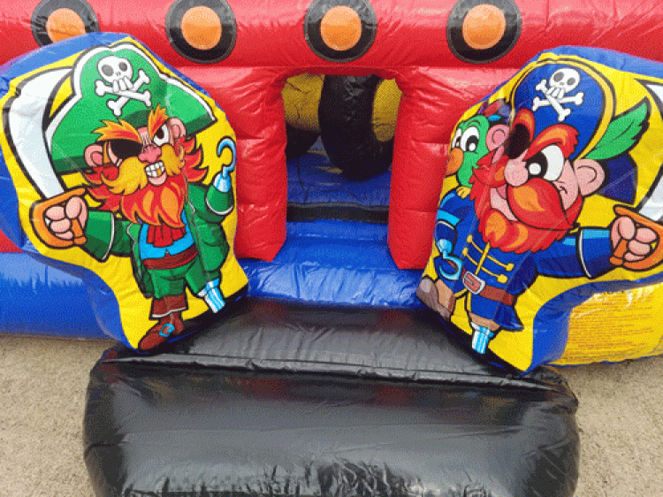 The Scallywag Ship will have them plundering on the high seas in no time, in this amazing realistic inflatable pirate ship. A pair of buccaneers greets each player at the ship's entrance, and inside kids can bounce in the ample jumping area, battle through the pop-up obstacles or enjoy the climb and slide located at the stern. The bounce house boasts impressive three-dimensional artwork, with a traditional pirate skull and crossed swords at the bow and ship's flag, along with a lookout on the mast. The ship itself has a life of its own, with a sharp-toothed face on the outside bow, the Lil Pirates bounce house is sure to please any landlubber!