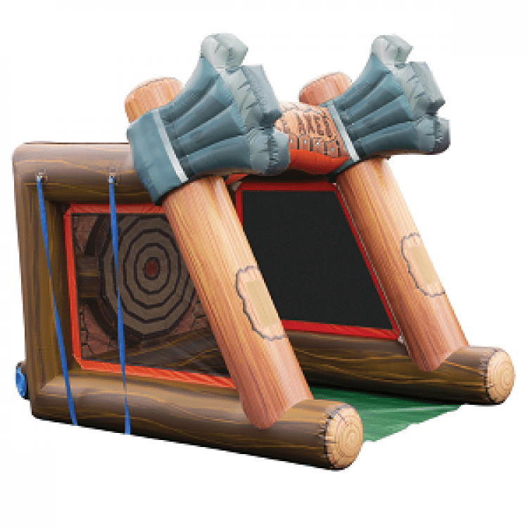 Made with commercial grade vinyl and designed with multiple shades of brown and tan to look aesthetically like wood grain, the inflatable axe throwing game will provide hours of entertainment for any party.