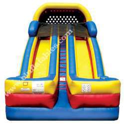 Turn up the fun with this 20' Dual Lane Dry Slide — a bold, colorful centerpiece that delivers fast, safe thrills for backyard parties, school events, church picnics, and community festivals. Two side-by-side lanes let kids race head-to-head after ascending the center ladder; hooded safety at the top keeps riders properly positioned before they launch down the slick, 20-foot slope to a cushioned landing with a built-in safety stop.  The slide's bright red, yellow, and blue palette attracts attention and keeps kids coming back for more high-energy play. Ideal when you want an exciting, non-water option that encourages healthy activity and friendly competition — a reliable, eye-catching rental that adds big value to any indoor or outdoor gathering.