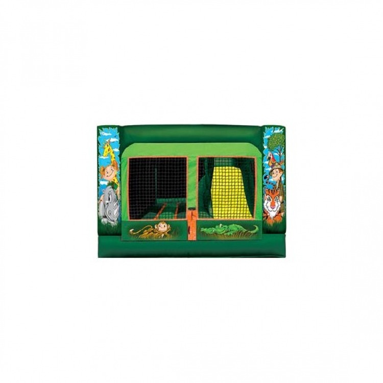 This bounce house and slide combo is ideal for kids ages 5 and under. Can be used outdoors or indoors (minimum ceiling height of 9 feet). Maximum recommended weight is 100 lbs per person.
